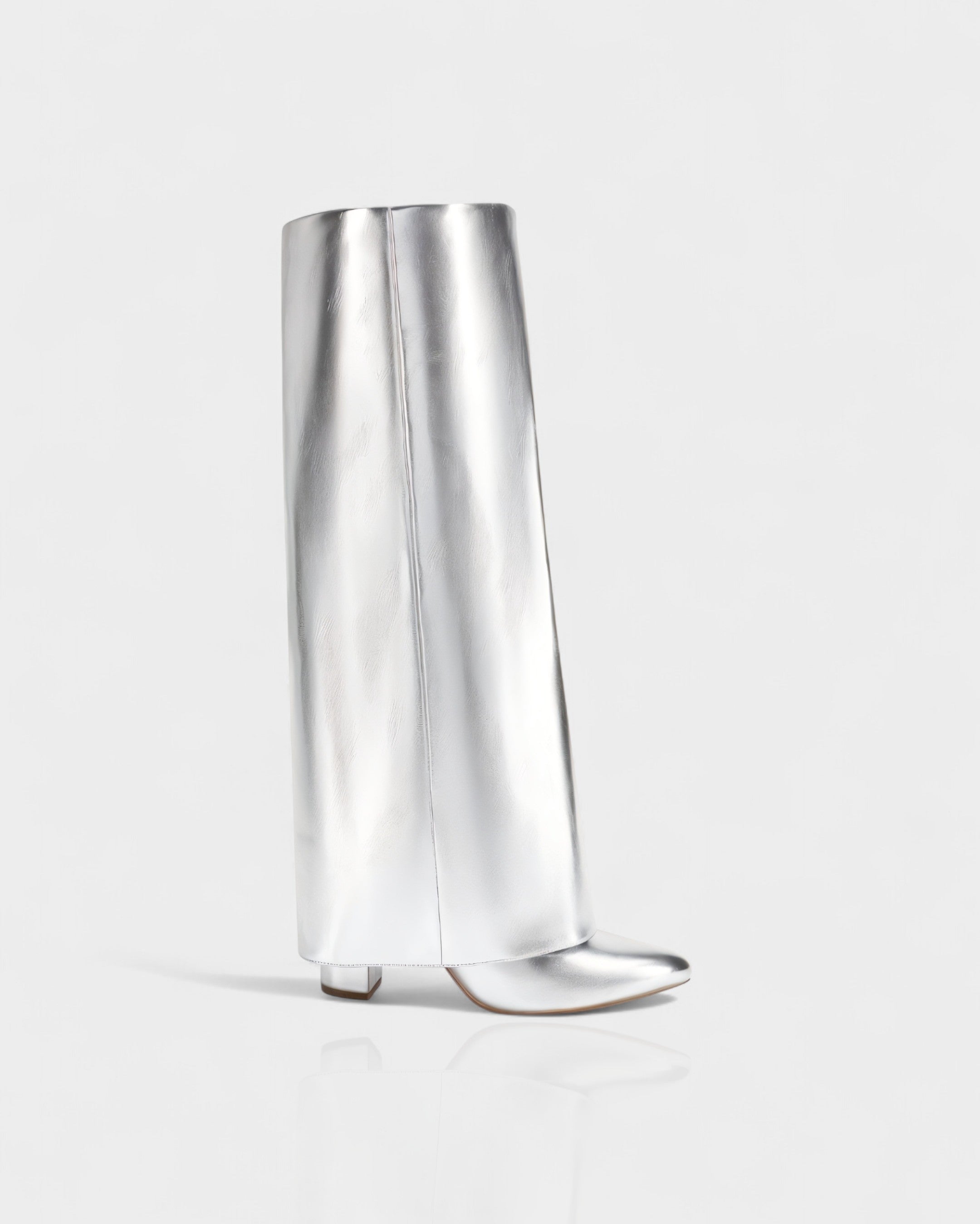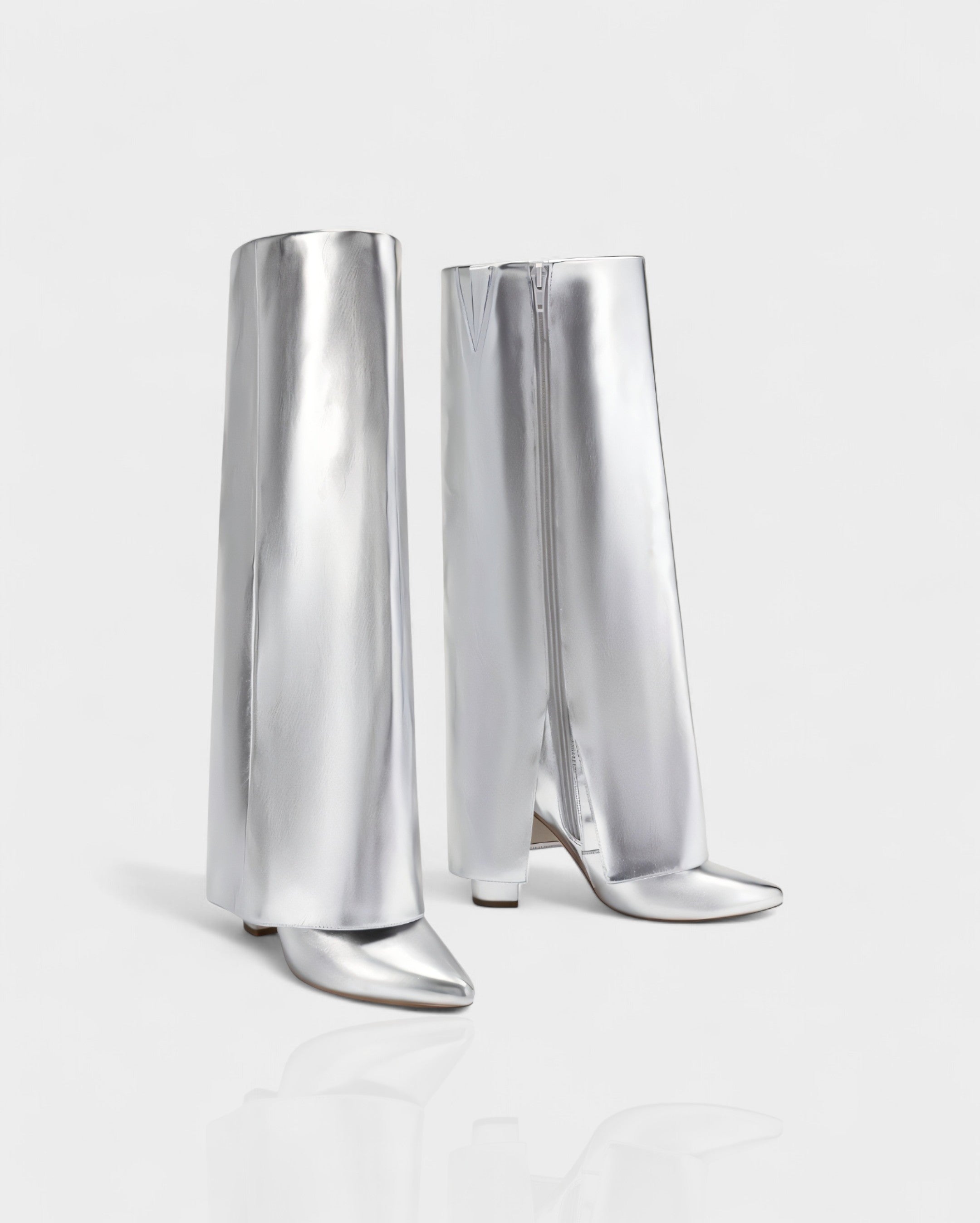 The Maisy boots feature a structured straight-leg silhouette with a sleek metallic finish that catches the light from every angle. Designed with a pointed toe and low block heel, they combine futuristic edge with a sculptural fit. A statement boot made to elevate any look with bold, modern shine.