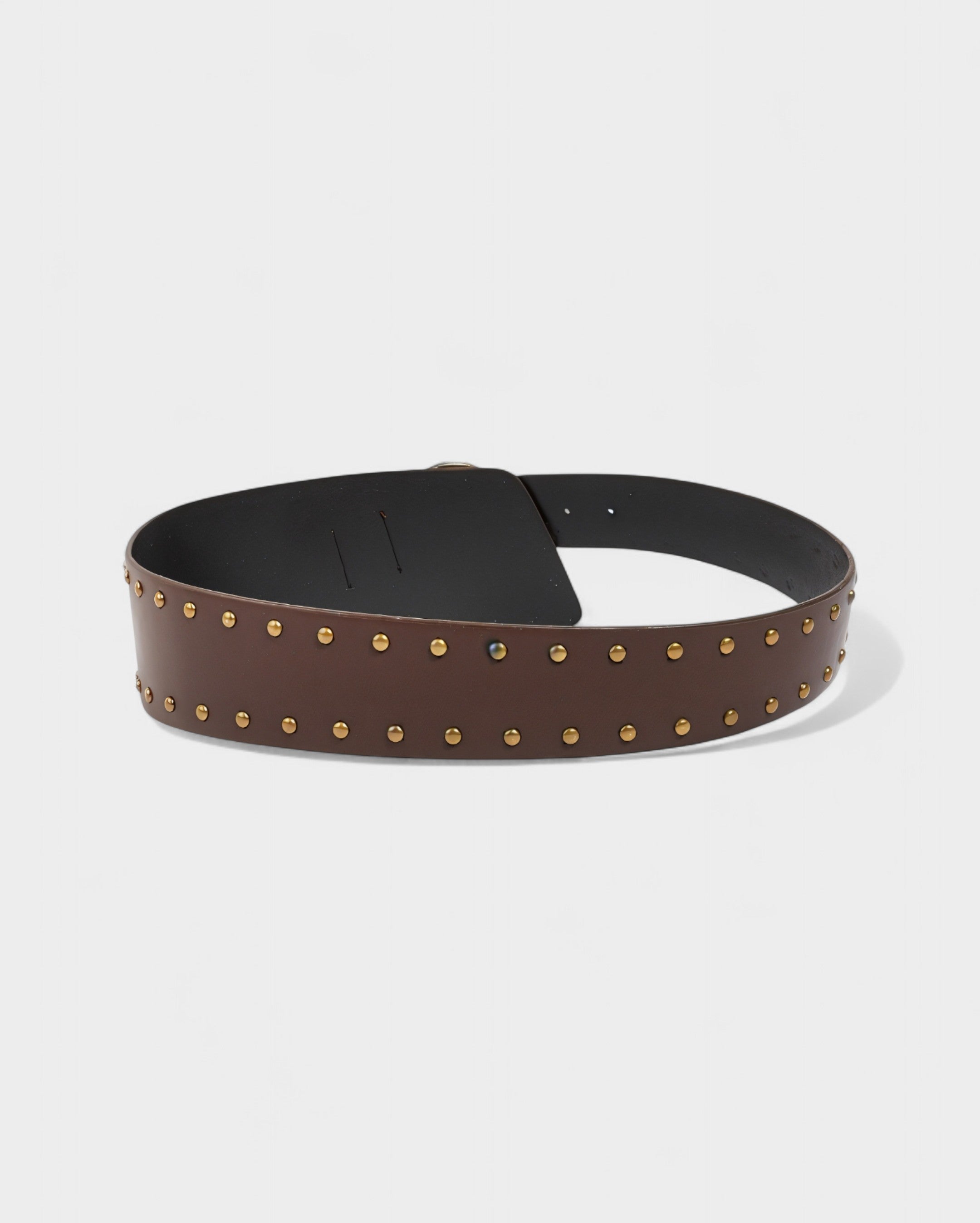 Cinch your waist in style with this bold statement belt. Crafted from sleek faux leather, it features all-over stud detailing for an edgy vibe. The wide design, large circular buckle, and asymmetrical pointed front create a flattering silhouette. Perfect for adding a touch of sophistication and attitude to any outfit.