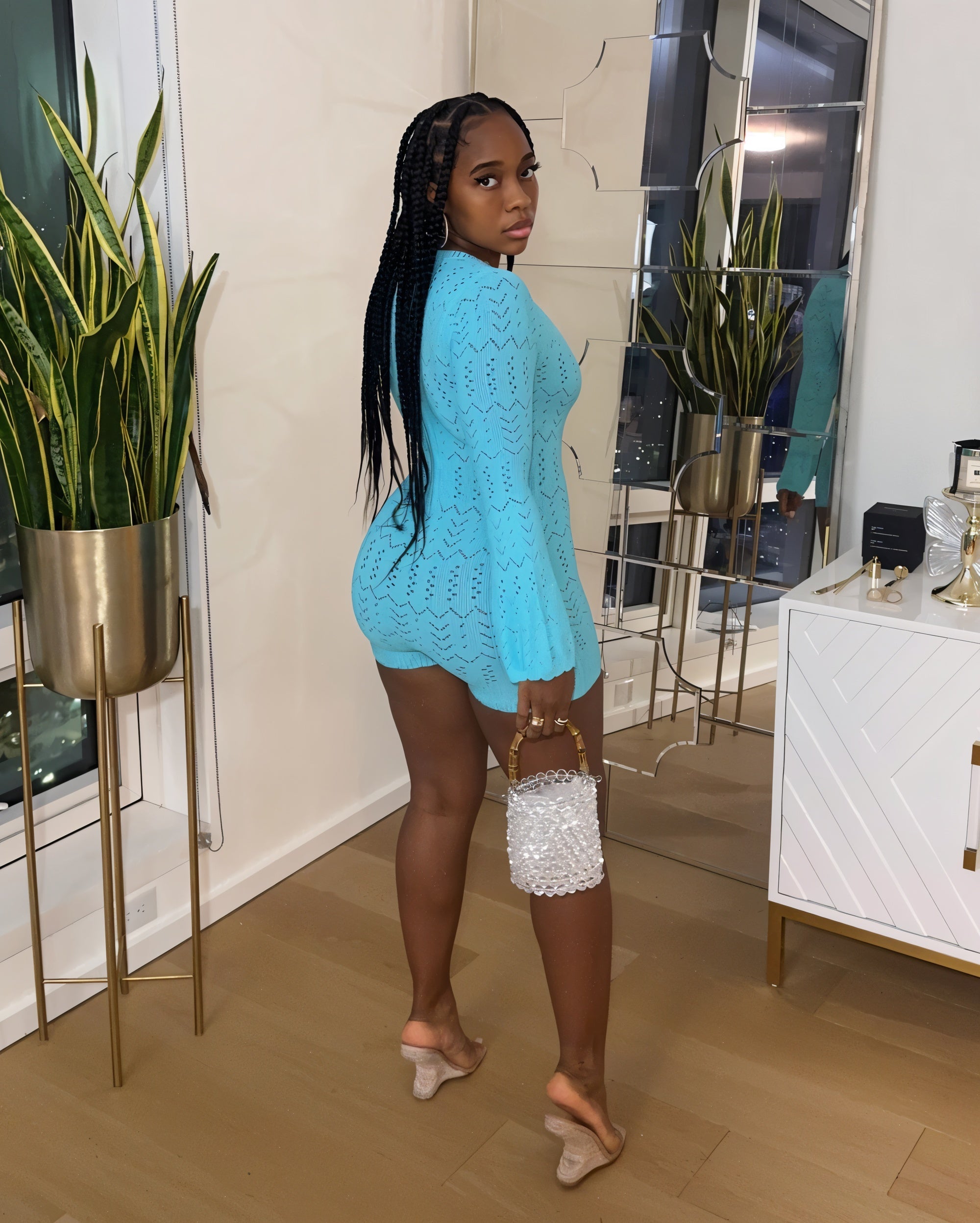 Embrace your playful side in this curve-hugging open-knit romper. It features a deep V-neck with a metal O-ring and flowy bell sleeves for boho charm. The delicate knit adds a subtly sexy, sophisticated touch.