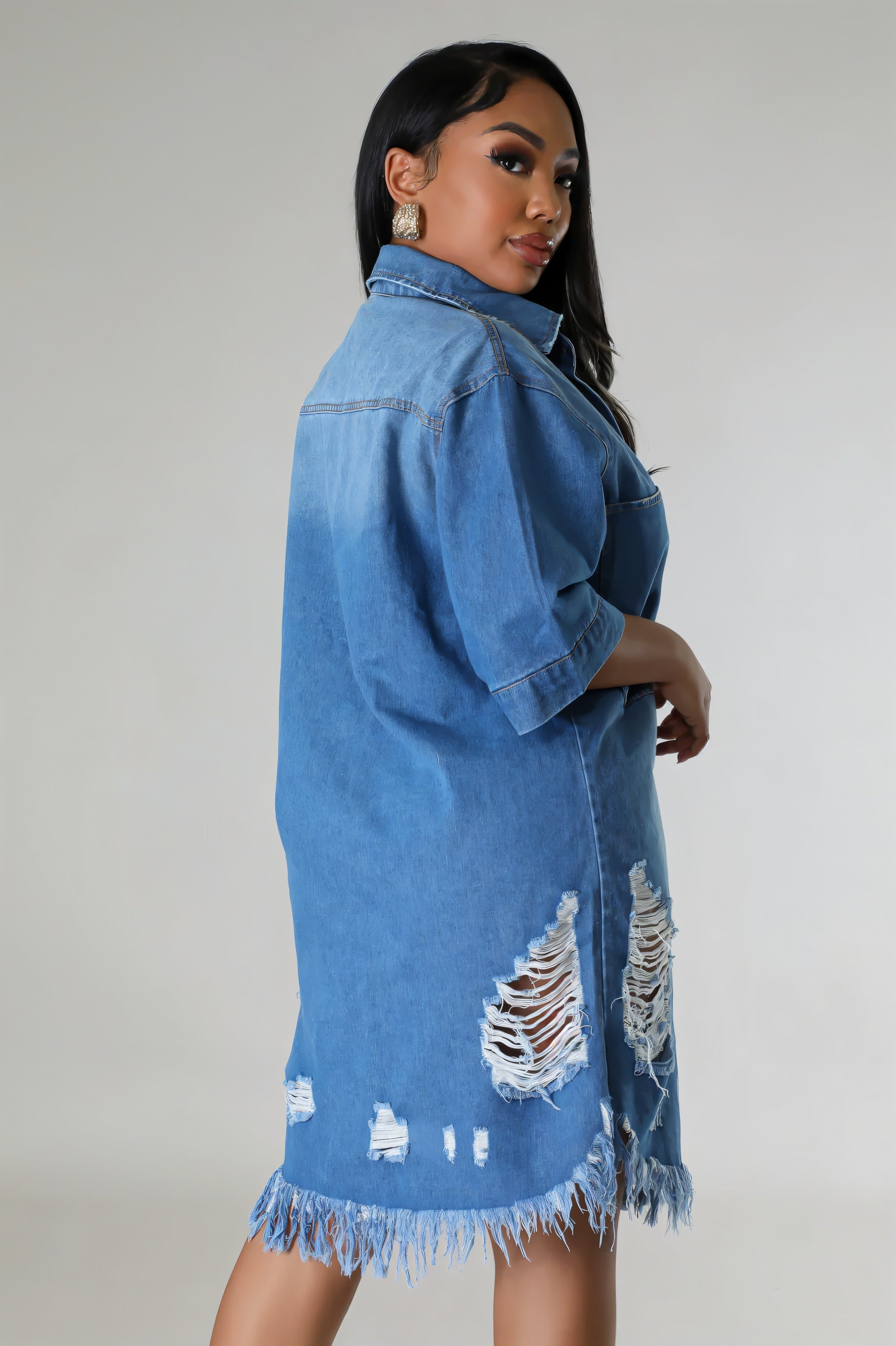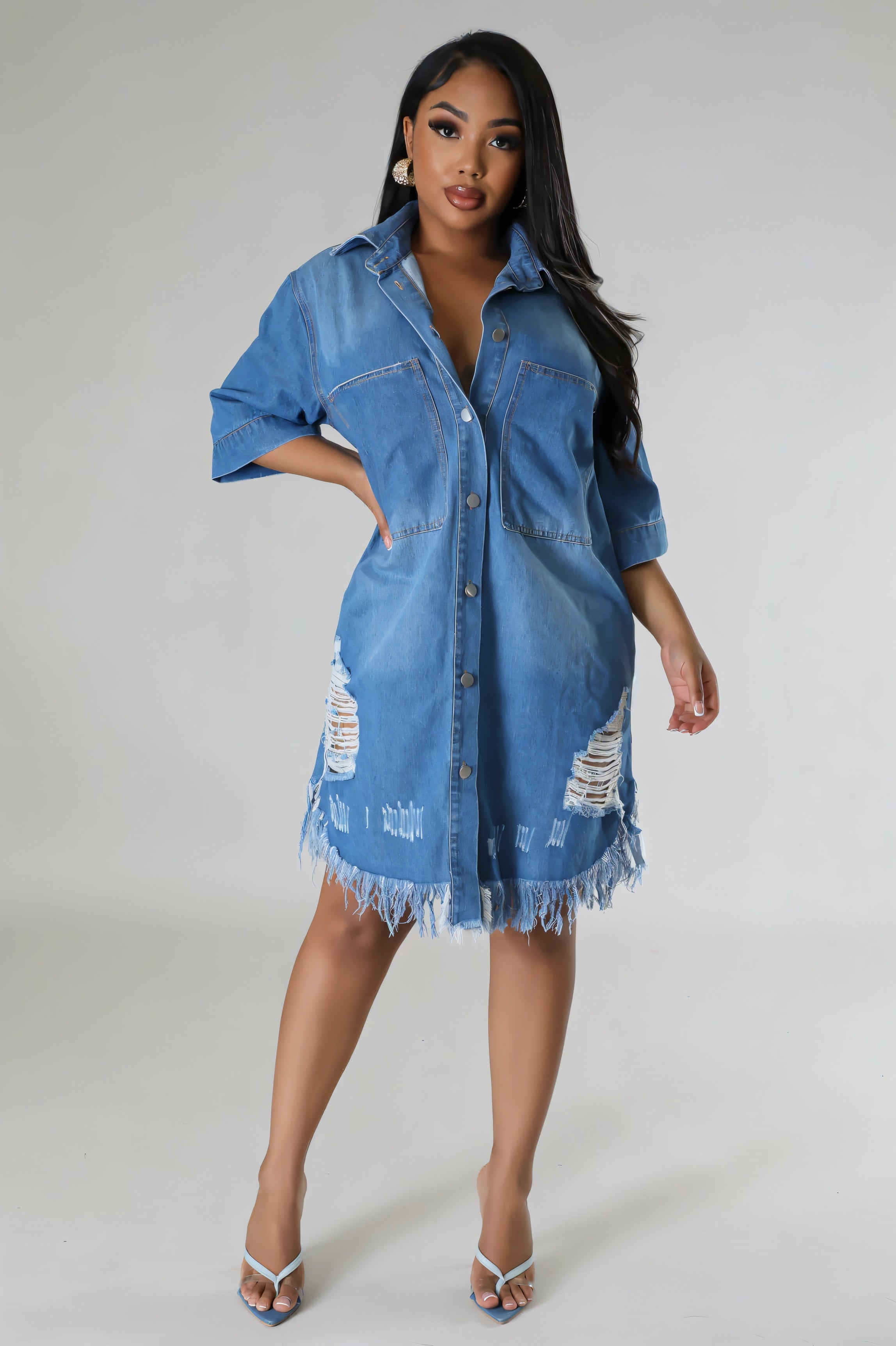 The Paula dress is your go-to for effortless denim edge with a laid-back vibe. This oversized button-down silhouette features elbow-length sleeves, a pointed collar, and large patch pockets at the chest for a utilitarian touch. Distressed detailing and a raw frayed hem add a rugged twist, making it ideal for styling up or down.