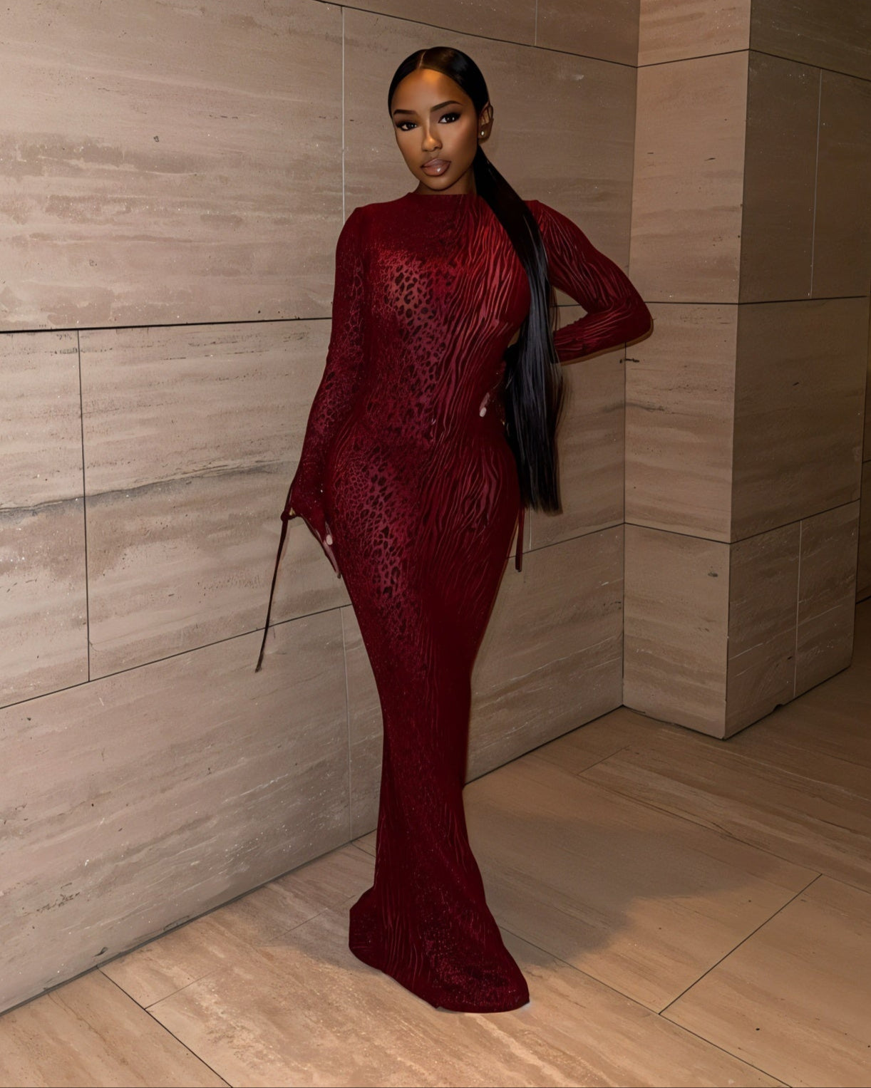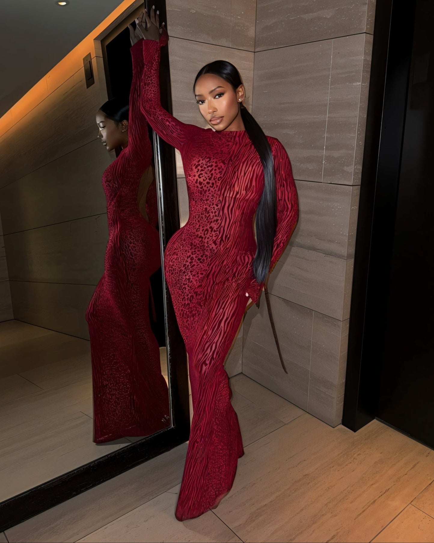 The Ashley mesh maxi dress features a bold mix of tiger, leopard, and zebra prints. With long sleeves and a high neckline, it offers a sleek front, while the dramatic open-back cut-out adds elegance and allure - perfect for standout evening events.