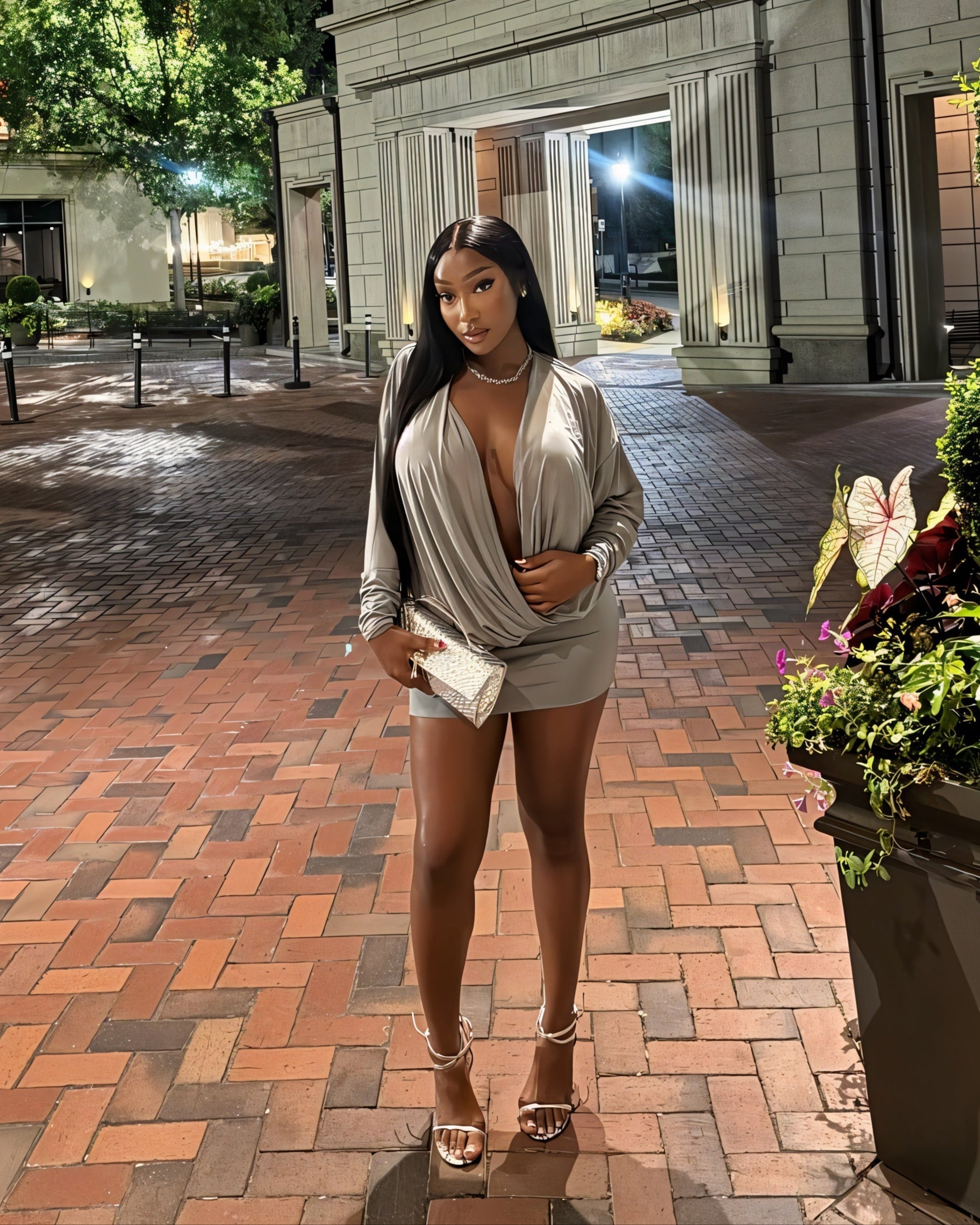 Serve sleek sophistication in the Mona Dress, designed with fluid draping and a curve-skimming finish. The plunging neckline adds daring contrast to the long sleeves, while the mini length keeps the silhouette bold and modern. Effortlessly chic, it’s a statement piece that balances elegance with edge.