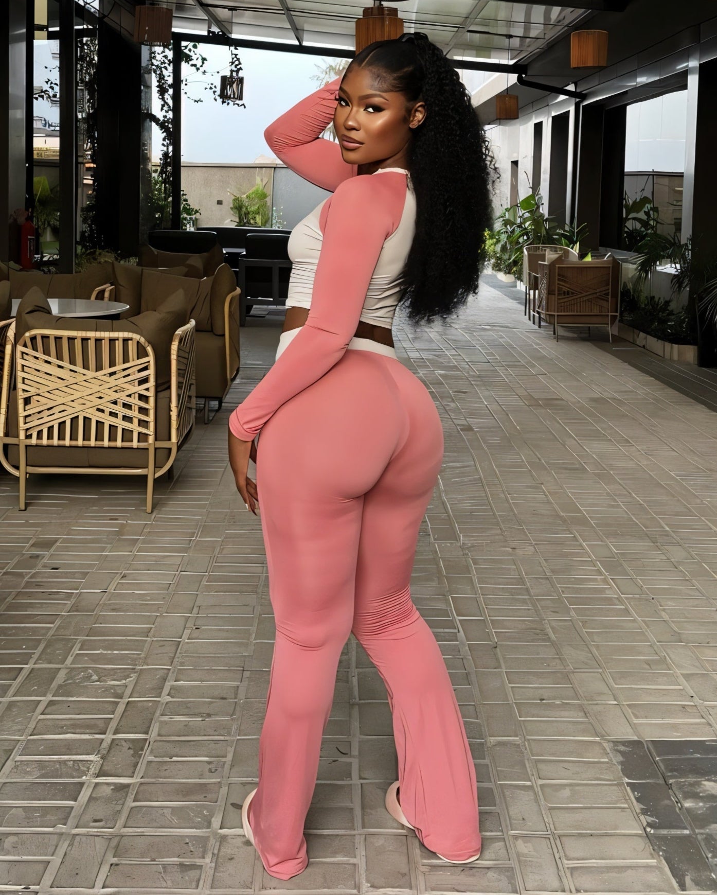 Step out in style with the Emelia Set, a chic two-tone pairing designed for a sleek and comfortable fit. This set features a long-sleeve crop top with a contrasting band, perfectly matched with flattering flare pants, crafted from a soft stretch fabric that moves with you.
