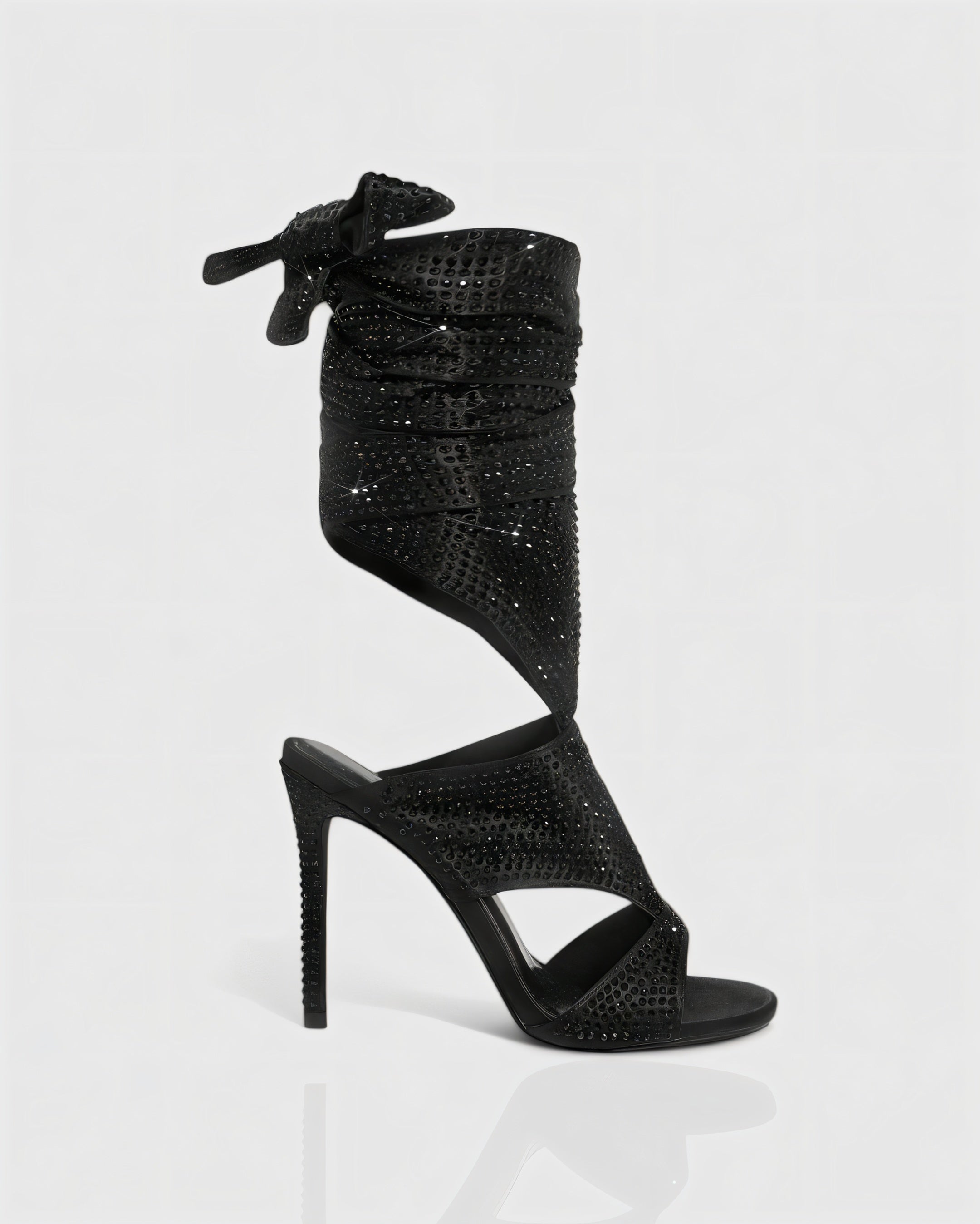 Step into the spotlight with these dazzling heels, crafted to turn heads. A sleek square toe and high stiletto heel set the stage, while rhinestone-embellished straps lace elegantly up to the knee. This bold design blends glamour with an irresistible edge.