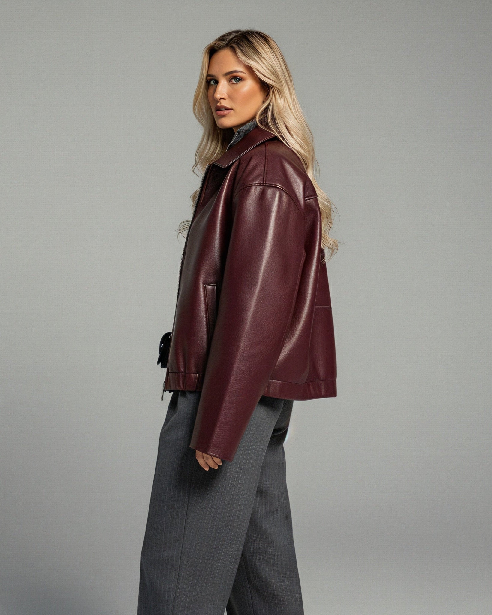 The Hanelle Jacket is a bold twist on a timeless staple. Designed with an oversized collar and sleek zip closure, this jacket delivers effortless edge while keeping its silhouette clean and minimal. The smooth leather finish and structured shape make it a versatile layering piece with modern attitude.