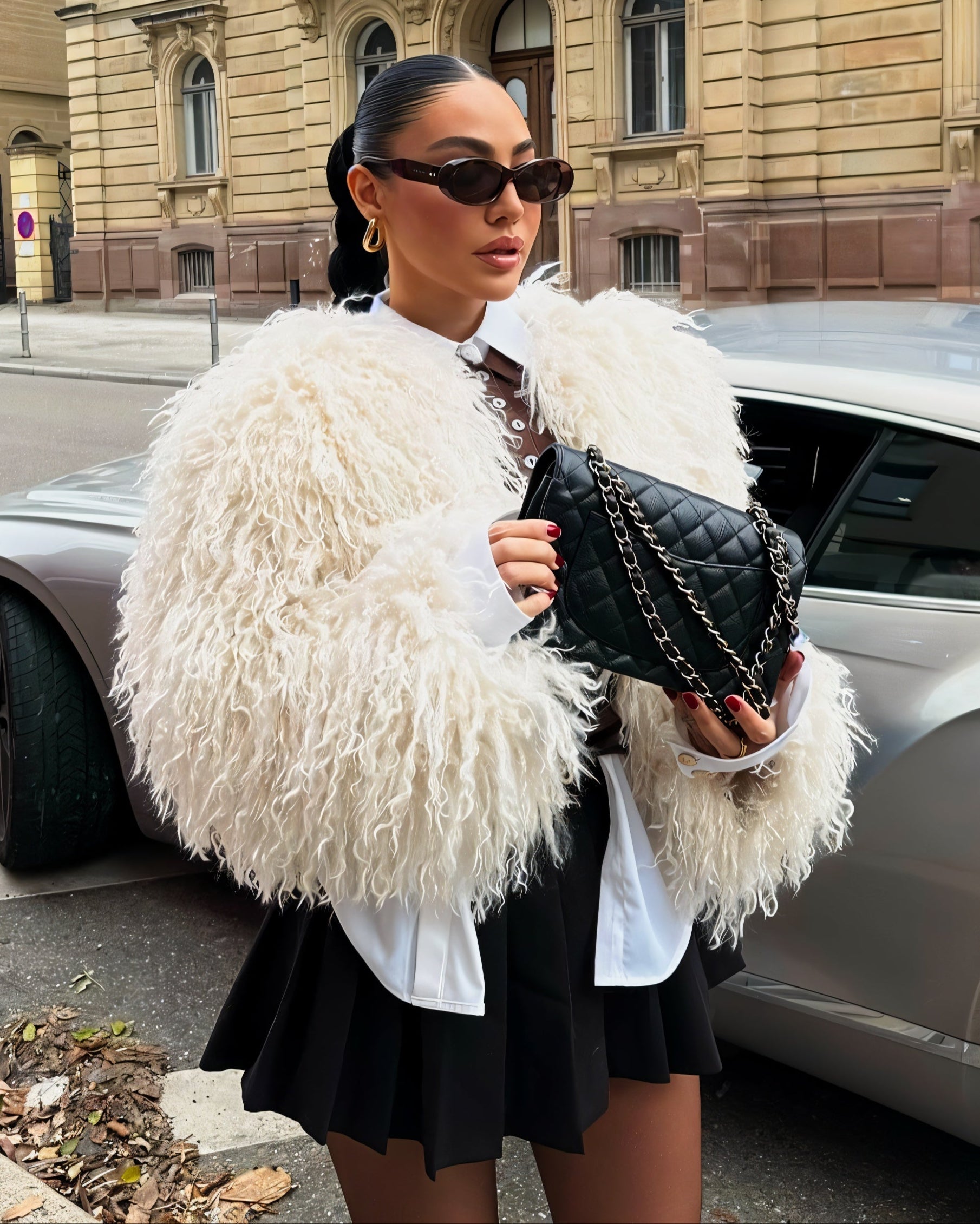 The Lona Jacket turns every street into a runway. With its shaggy fur-effect texture and oversized fit, it serves full-on drama. A structured lapel adds polish to the bold silhouette. Luxe, cool, and made to stand out.