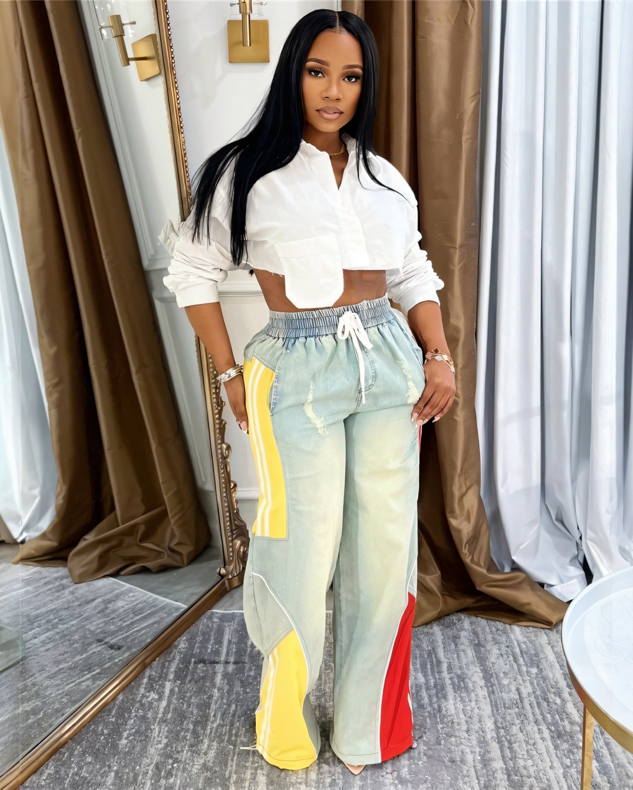 Street meets sport in these bold denim pants. Featuring a comfy high-rise fit, distressed front accents, and bold colorblock panels with side stripes these pants bring major energy wherever you go.