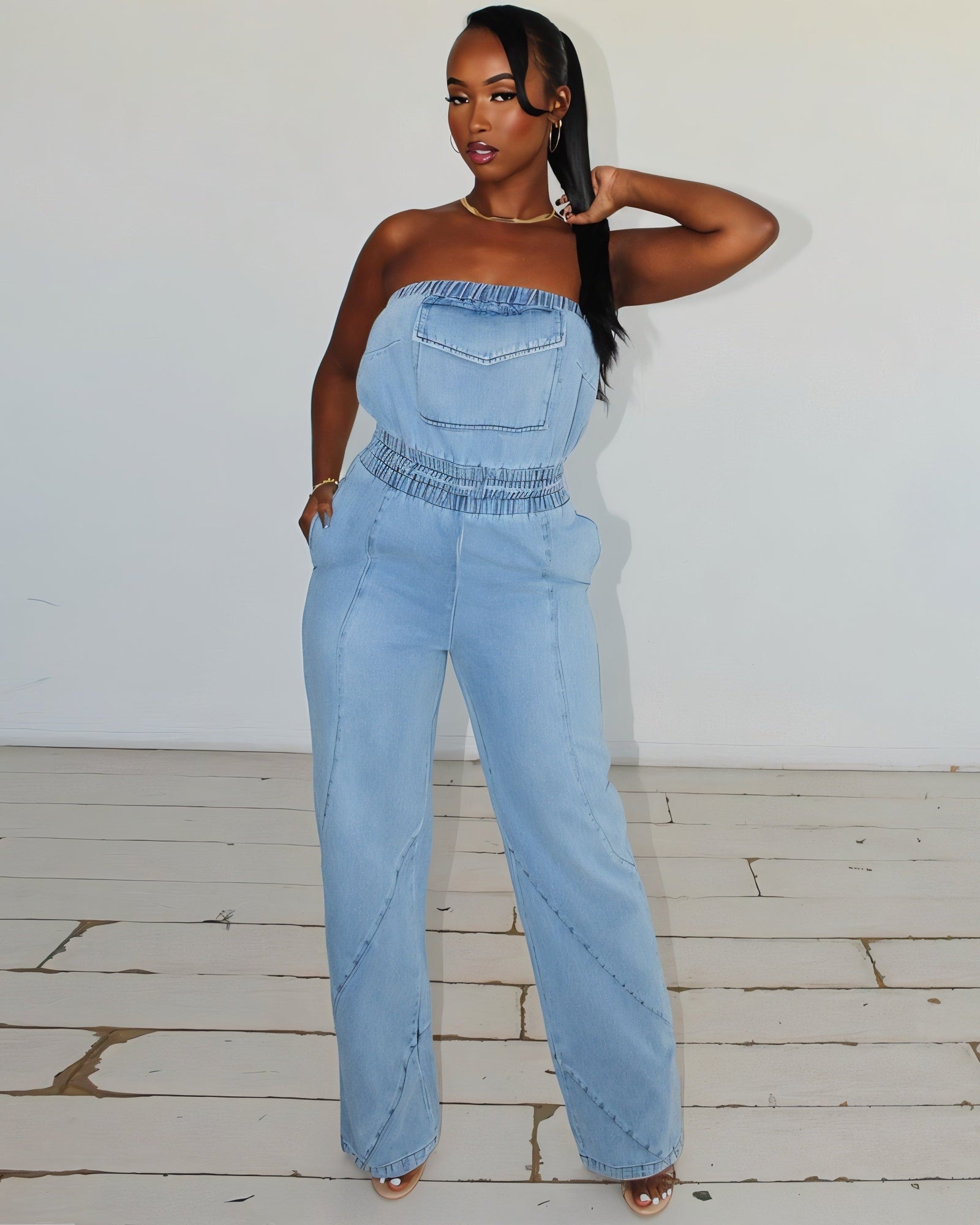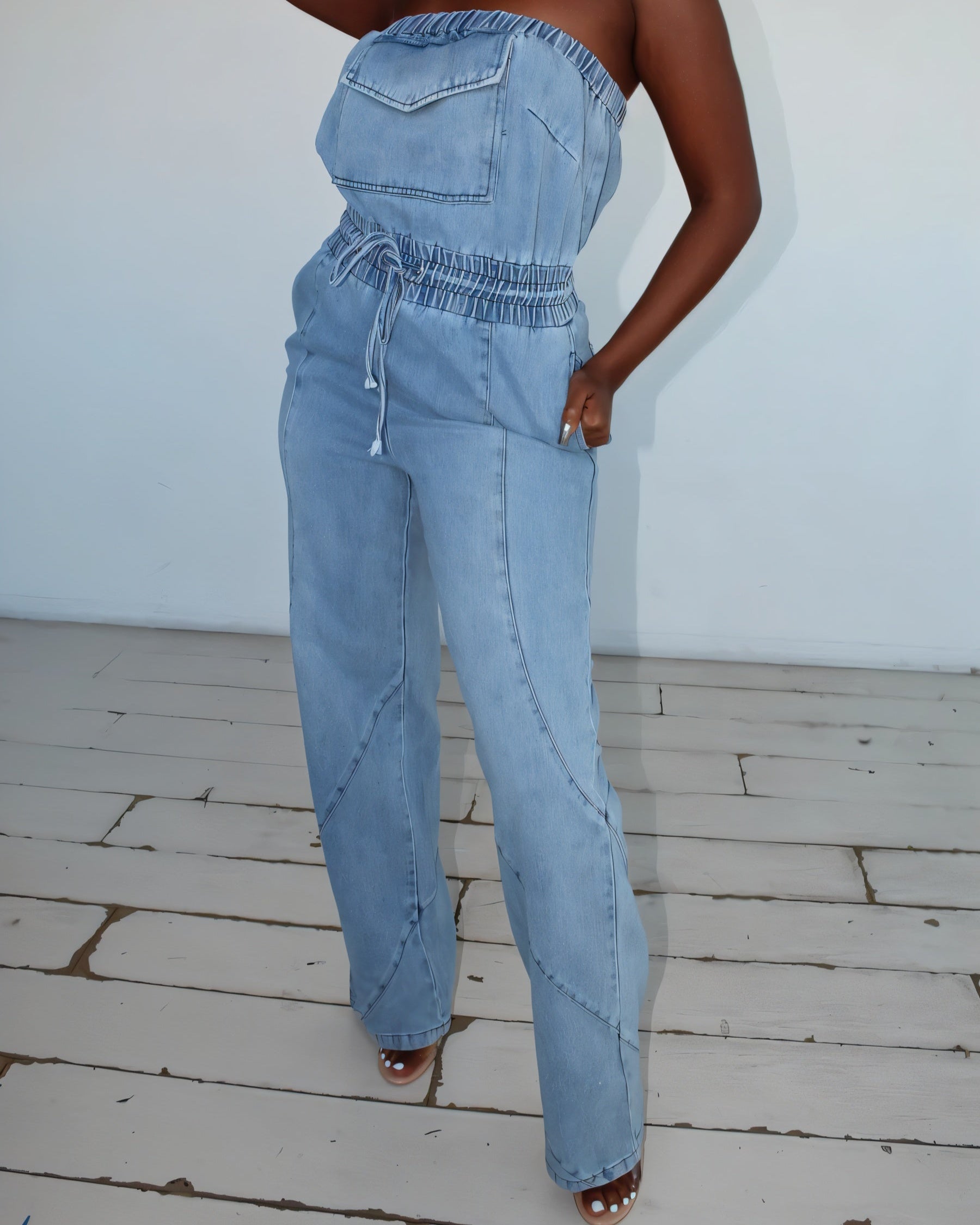 This chic denim jumpsuit offers a fresh take on casual style, featuring a flattering strapless design and a comfortable drawstring waist. Crafted from soft denim, it combines ease with effortless cool, while the wide-leg silhouette creates a relaxed yet stylish profile.