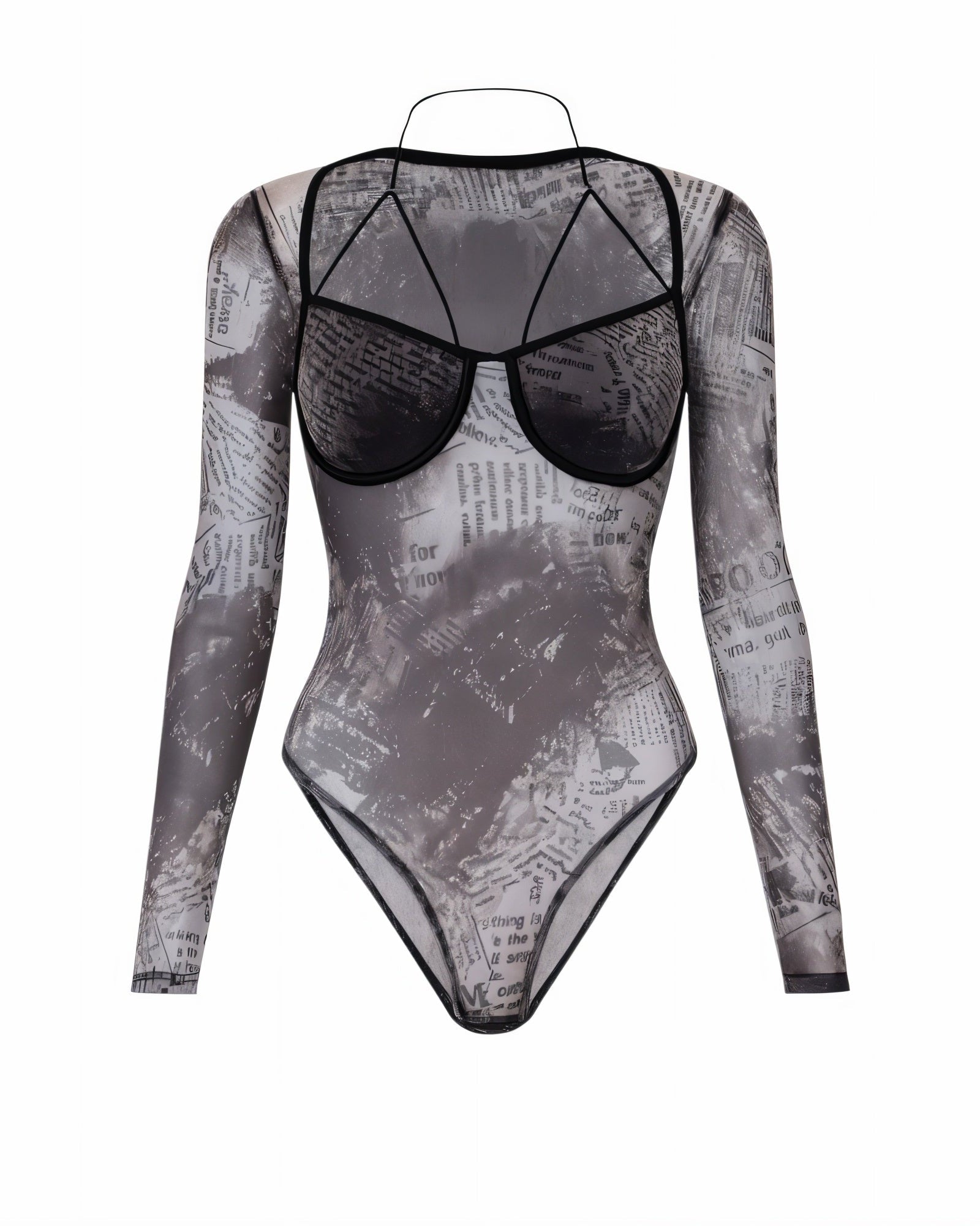 ZHONYA Newspaper Print Mesh Harness Bodysuit