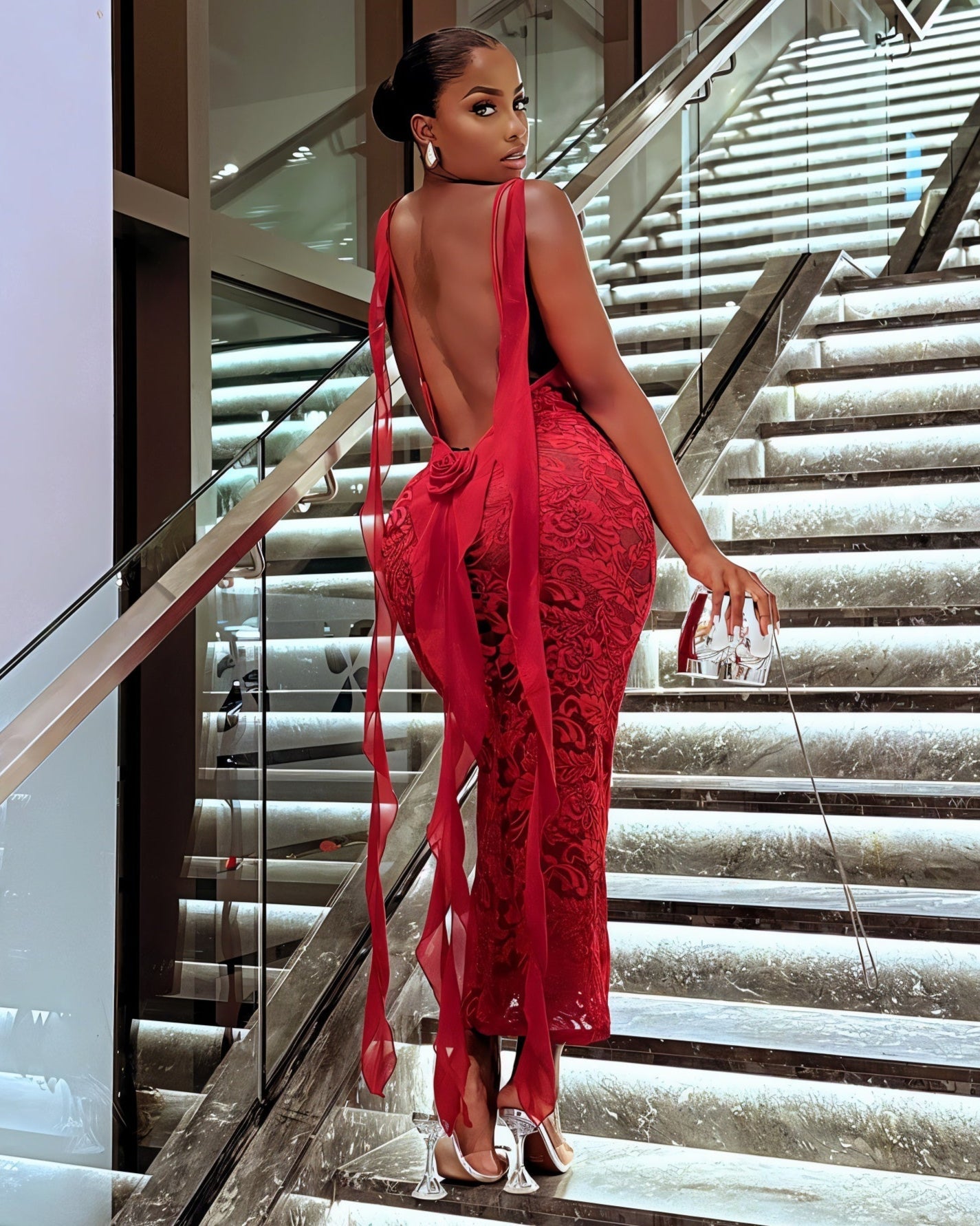 Turn heads in the Elisa midi dress. Designed with a semi-sheer floral lace overlay, this dress features a low-cut back accented by a statement chiffon rose and long ribbon ties. The body-hugging fit contours your silhouette, while the scoop neckline and thin shoulder straps add a soft, feminine touch.