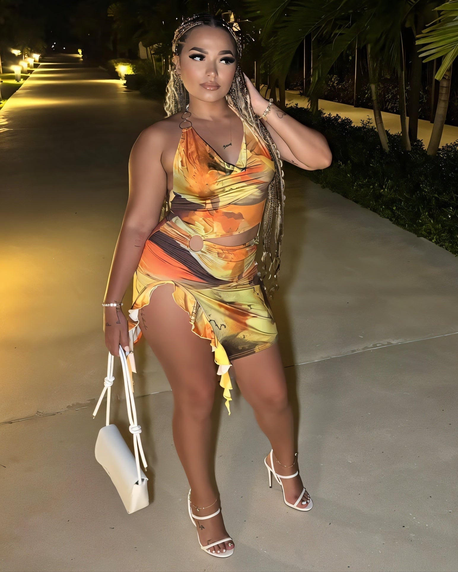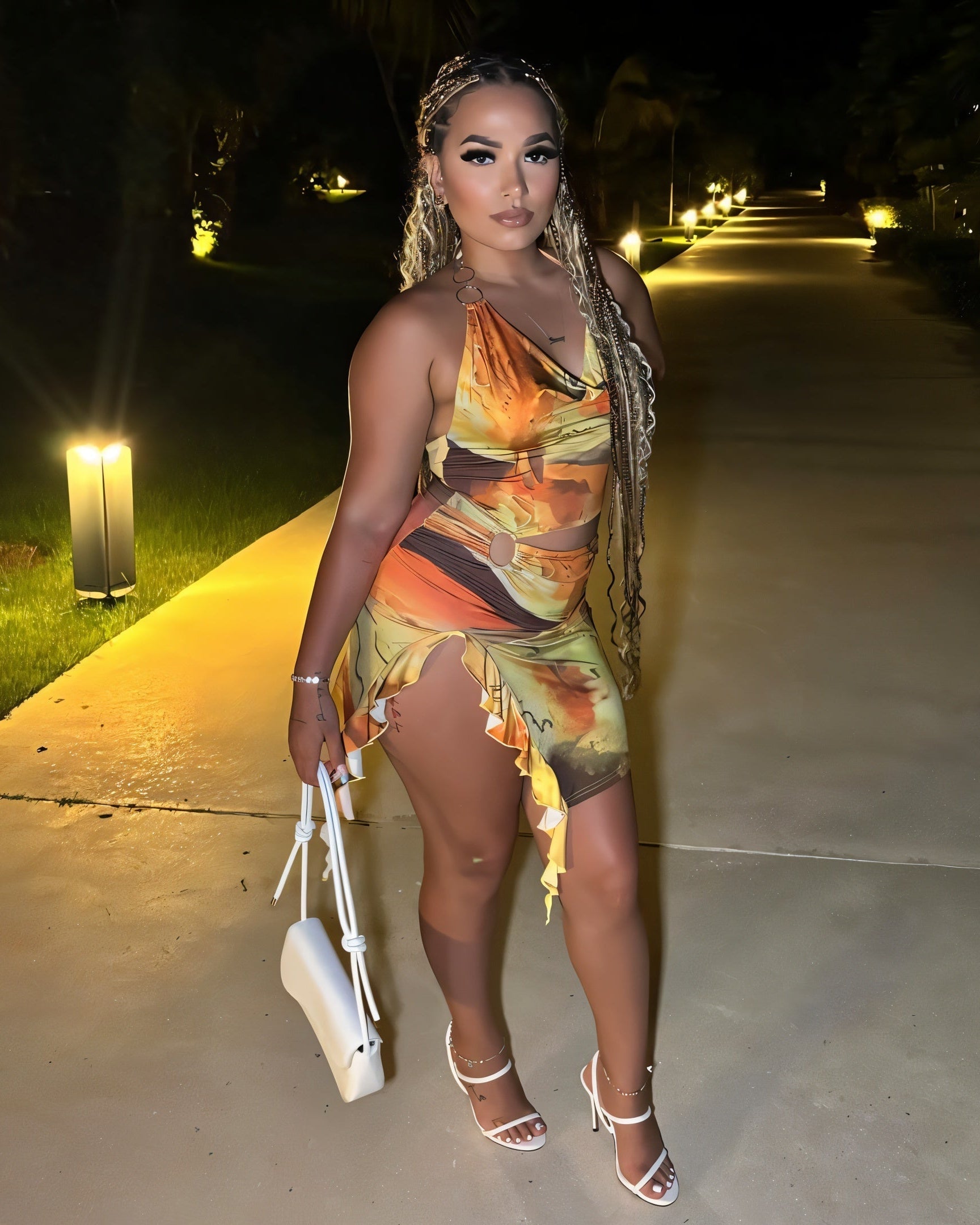 Fire print, flirty cut, and a silhouette made to stun. The Criselda mini dress features a draped cowl neckline, adjustable halter ties, and a ruched bodycon fit that hugs every curve. A high slit with side ring detail adds the edge.