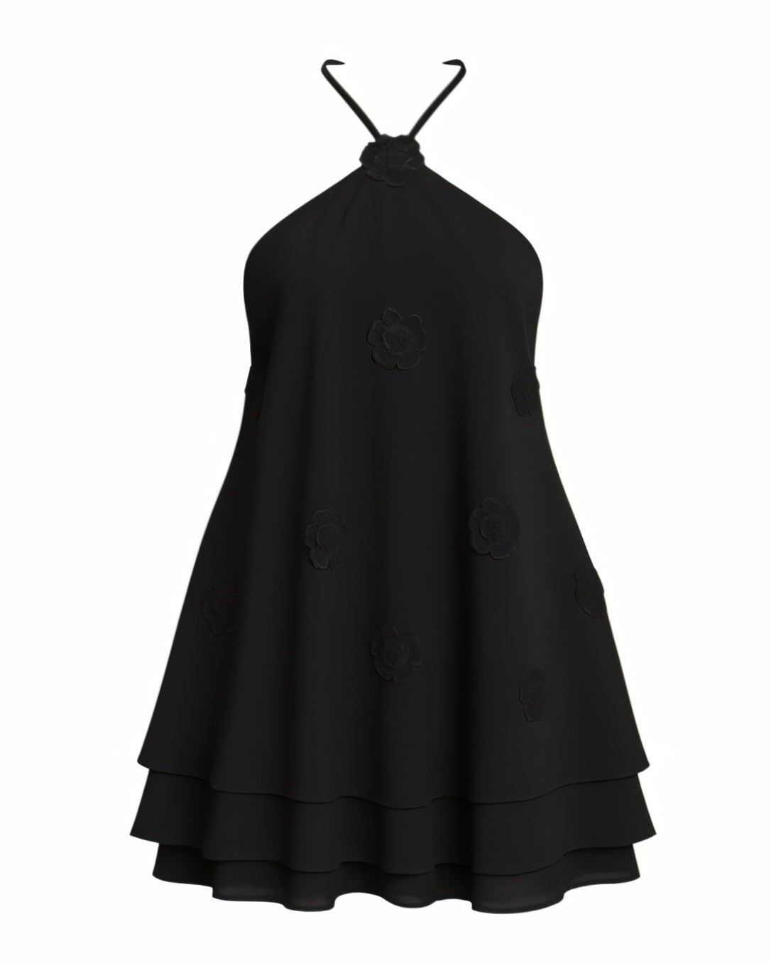 The Emeliya dress features a breezy, A-line silhouette crafted in a lightweight chiffon-like fabric. Designed with a halter neckline that ties behind the neck, it beautifully highlights the shoulders and collarbones. Subtle 3D floral appliqués are scattered throughout, adding delicate texture and charm.