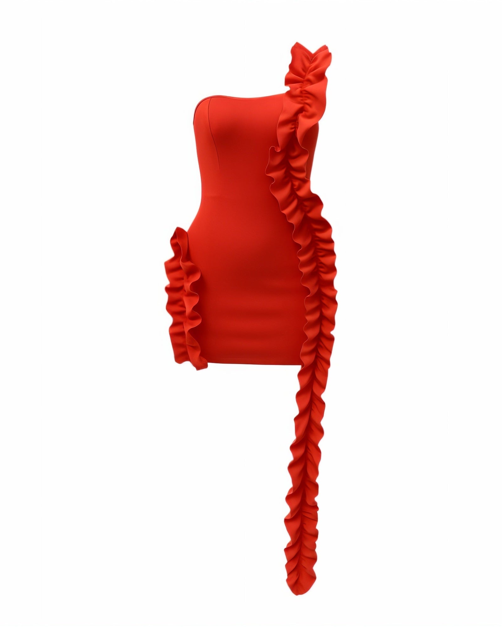 When soft meets bold. This sculpting bodycon dress steals the show with dramatic cascading ruffles from shoulder to hem. The curve-hugging fit adds heat, while the sculptural textures bring high-impact glam. It’s a whole moment, front, side, and back.