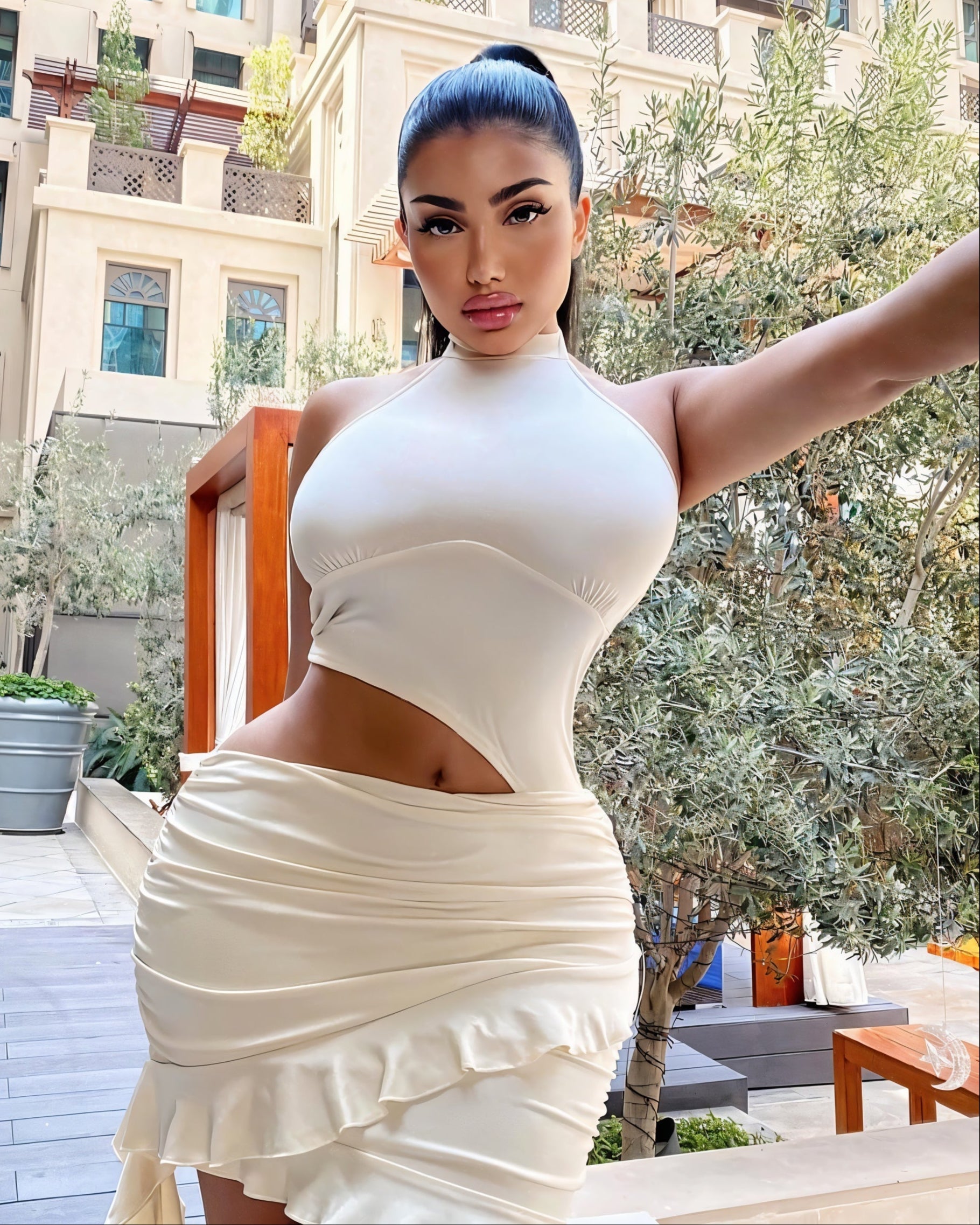 Designed with a sleek high neckline and dramatic side cutout, this one-shoulder piece brings modern glamour to the forefront. The curve-enhancing ruched skirt features asymmetrical draping and a cascading ruffle trim that adds soft, fluid movement.