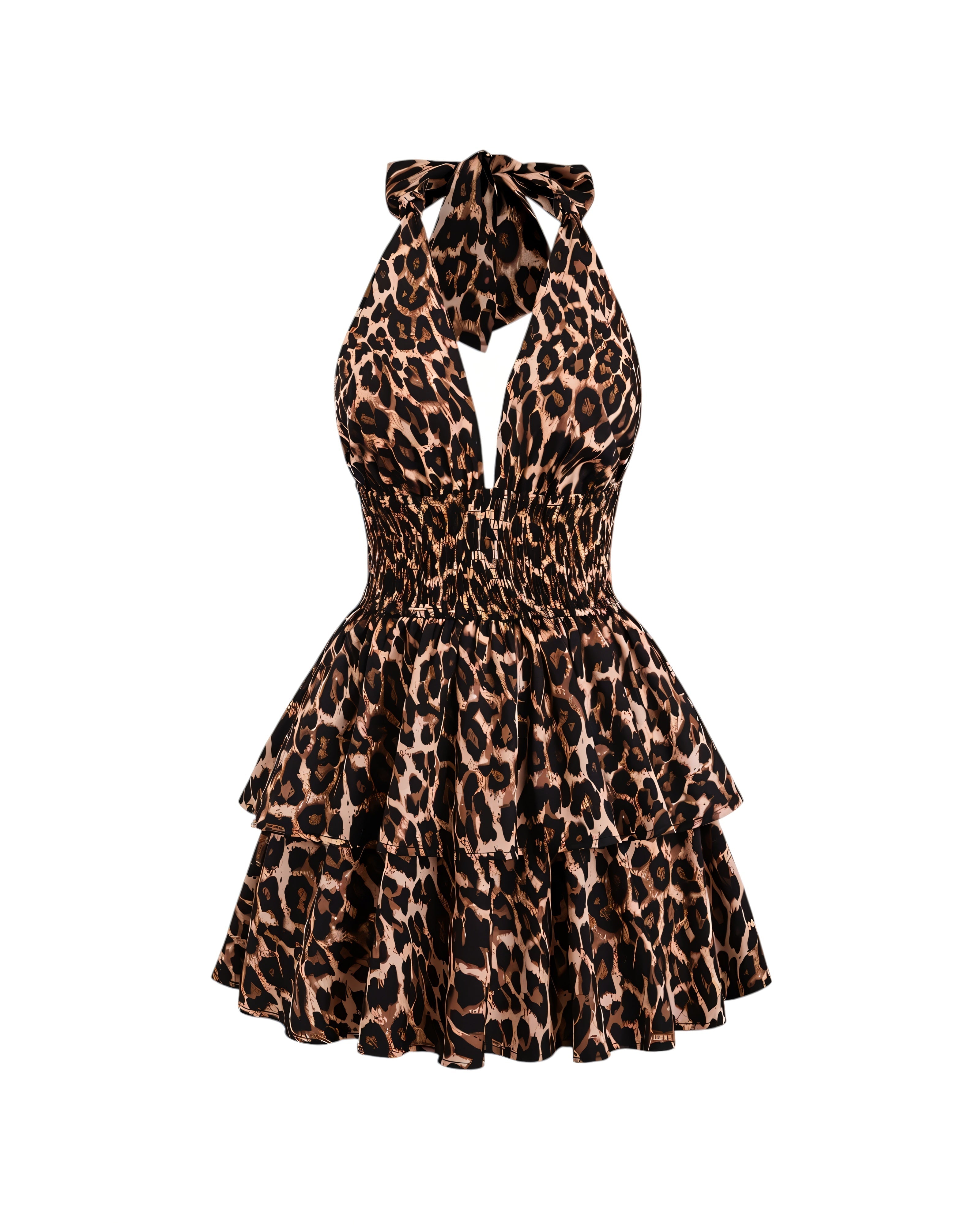 Turn heads with every step. This halter mini dress features a flirty plunge neckline, ruched waist, and layered ruffle skirt that brings serious movement. Fierce, fitted, and ready for your wild side.
