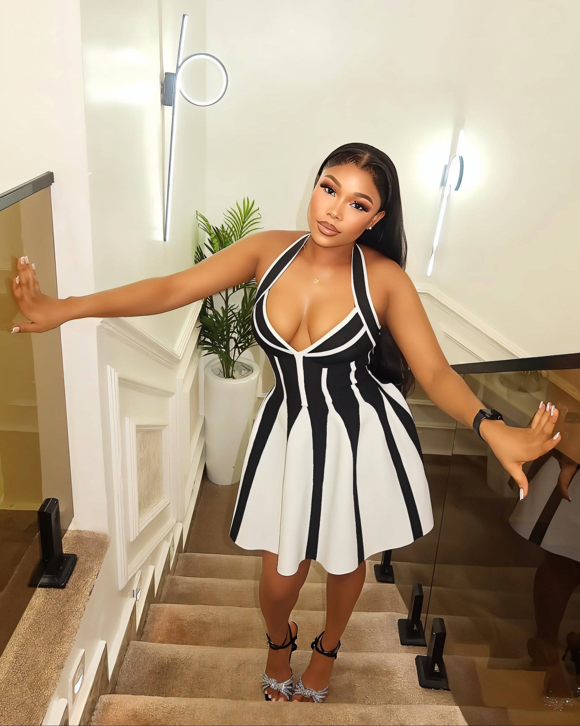 The Amaril Dress is a striking halter mini that redefines monochrome elegance. Featuring a plunging neckline and a fitted bodice, it flows into a voluminous skirt with bold black-and-white paneling that creates a sculpted, hourglass illusion. Both playful and polished, this dress is the perfect choice for making a confident statement.