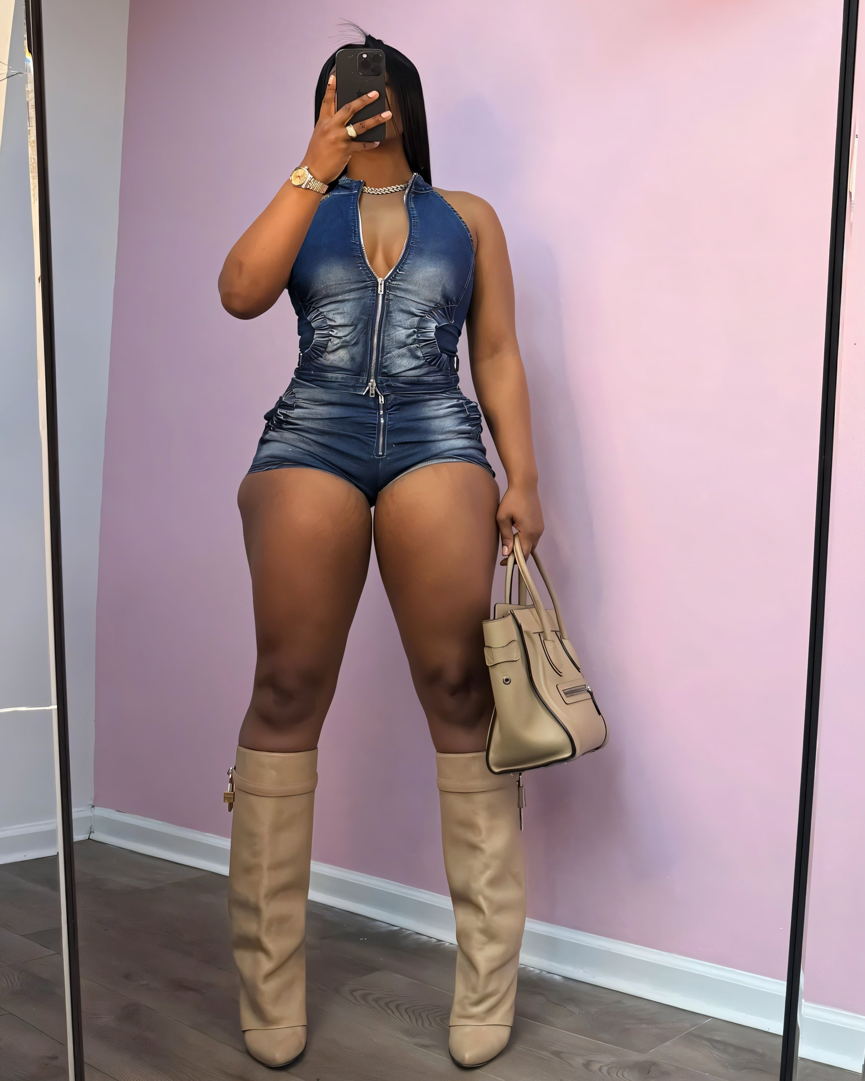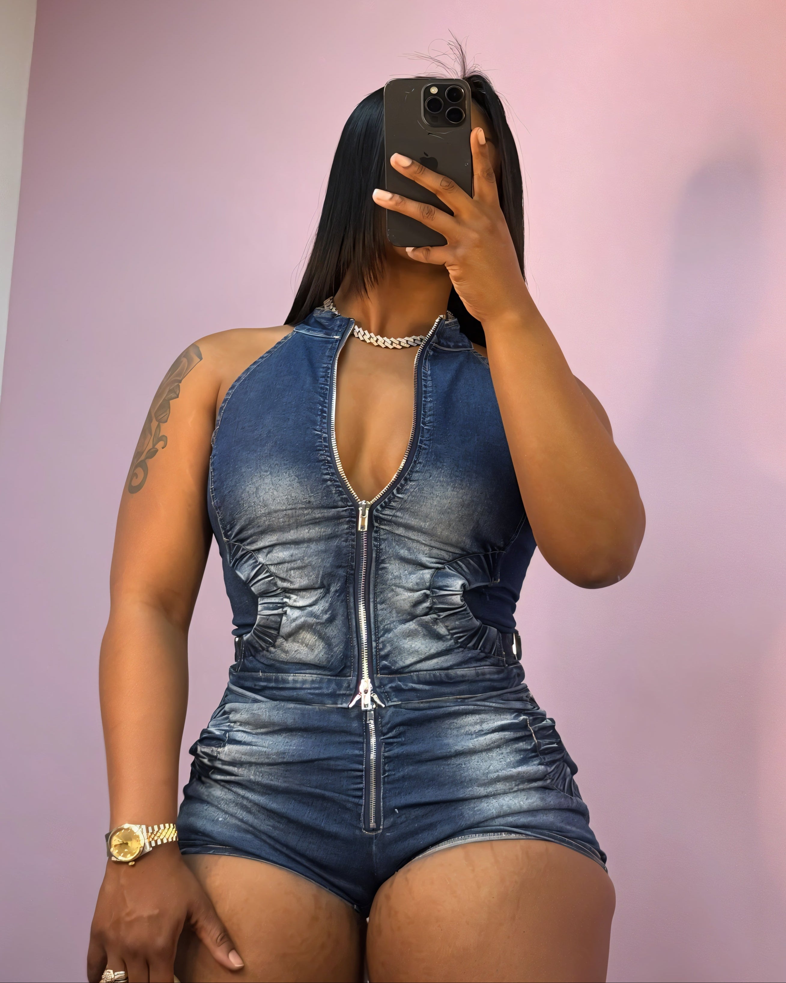 The Carmina Set is a bold, body-contouring two-piece featuring a sleek mock neck crop top and ultra-short fitted shorts, both designed in a denim-effect stretch fabric. Strategic ruching at the sides enhances the silhouette, while exposed front zippers on both pieces add an edgy, utilitarian finish.