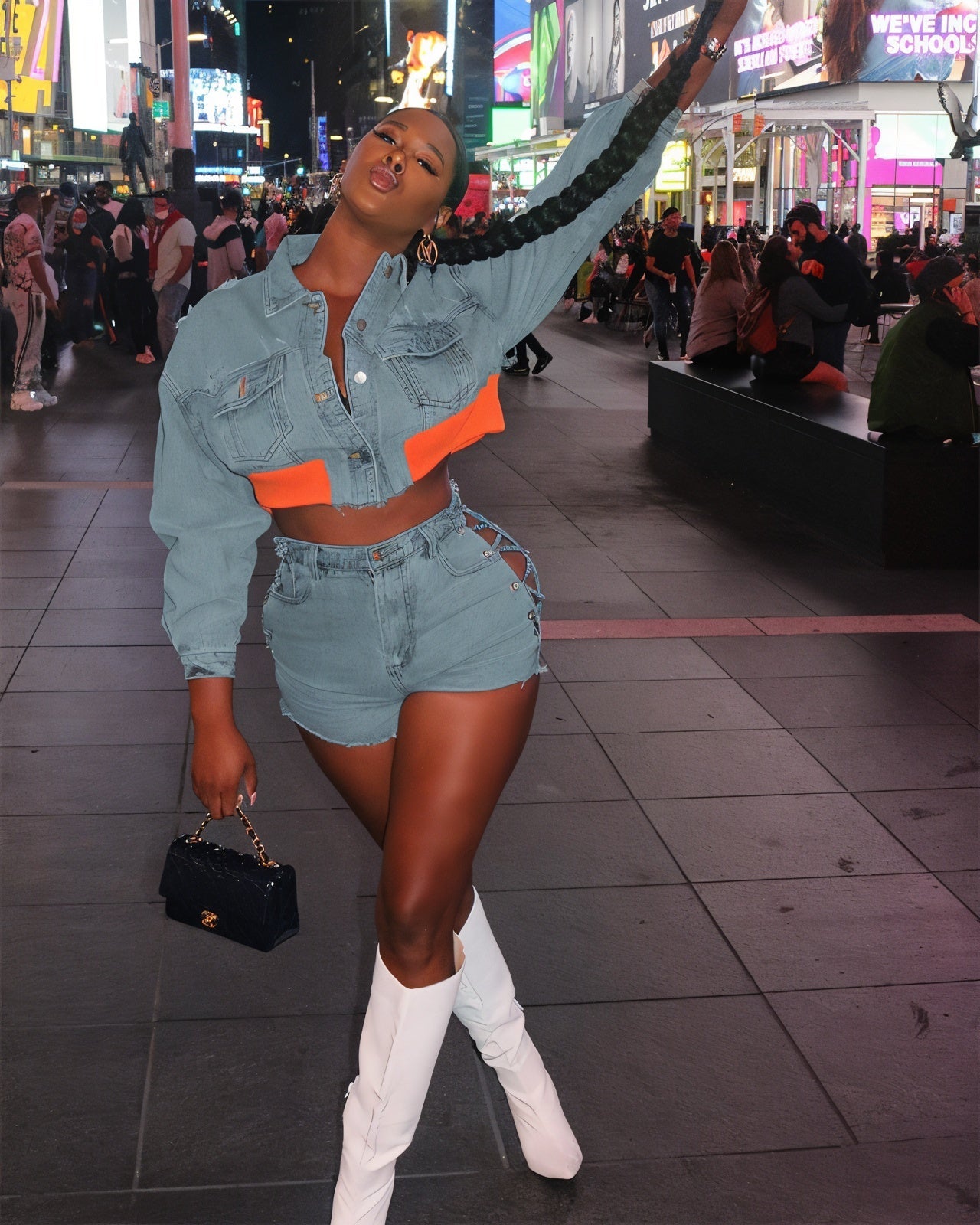 The Haven set is your edgy-meets-effortless denim moment. Featuring a cropped, raw-hem denim jacket with an pop of orange contrast and a pair of matching lace-up side shorts, this look brings heat to classic streetwear. The distressed details and bold colorblock make it perfect for turning heads day or night.