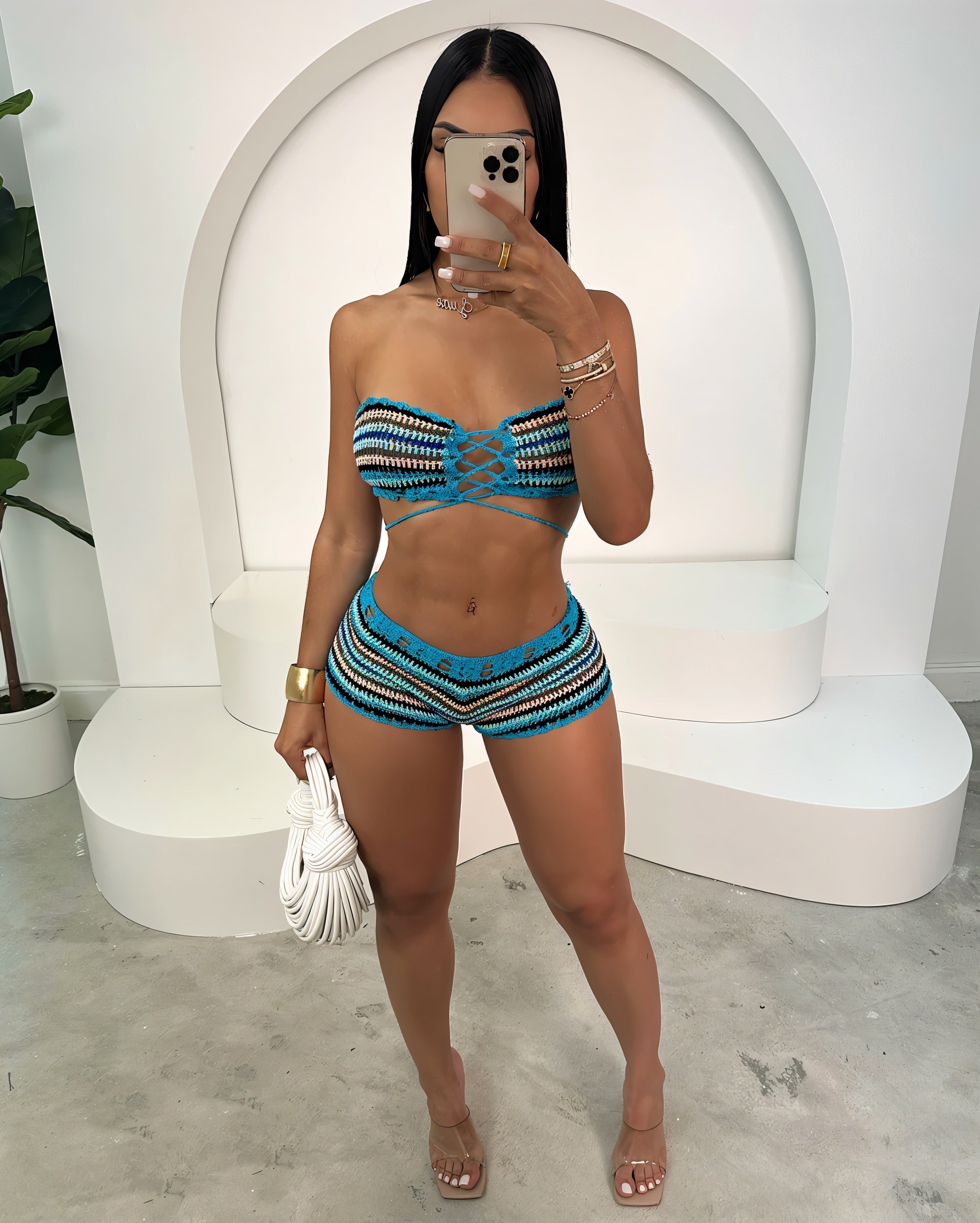 Soft texture, hard energy. The NYXA Set blends delicate crochet with bold design for a look that’s anything but sweet. The off-shoulder crop top features a lace-up front that sculpts the bust, while the matching high-rise shorts hug your hips with a lace-up detail that’s all about attitude.