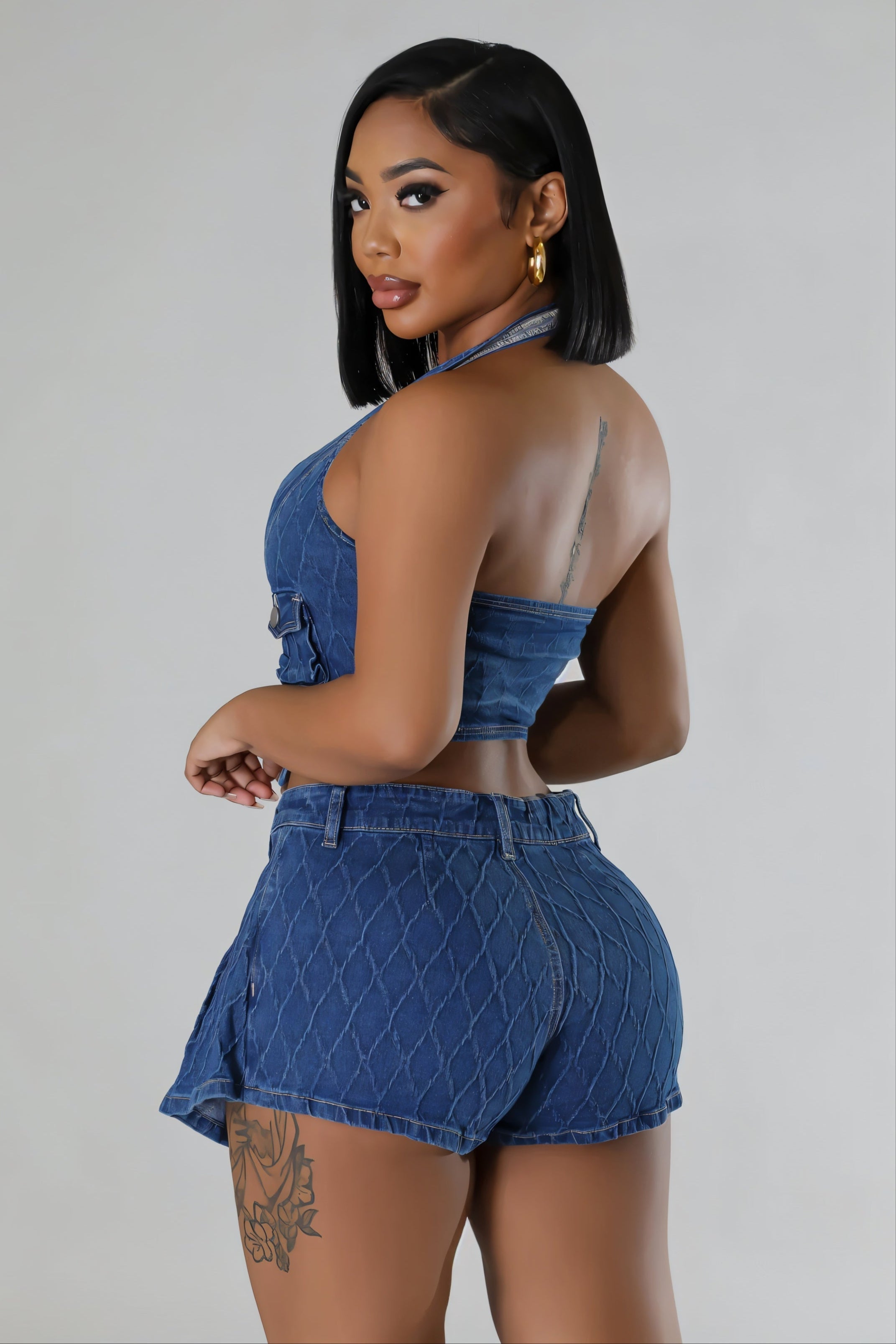 Step out in fierce denim style with the Reign Set, a captivating duo designed to make a statement. This matching set features a structured halter crop top with button details and a chic pocket, perfectly complemented by a pleated denim mini skort with a flattering A-line silhouette.