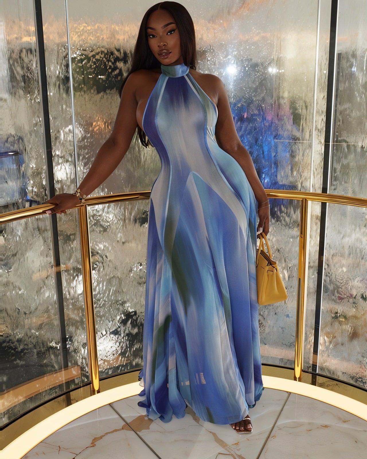 Designed with a high neckline and sleeveless cut, it creates a sleek silhouette while the flared hem adds effortless movement. The flowing fabric features a soft watercolor print, blending hues in a painterly effect.