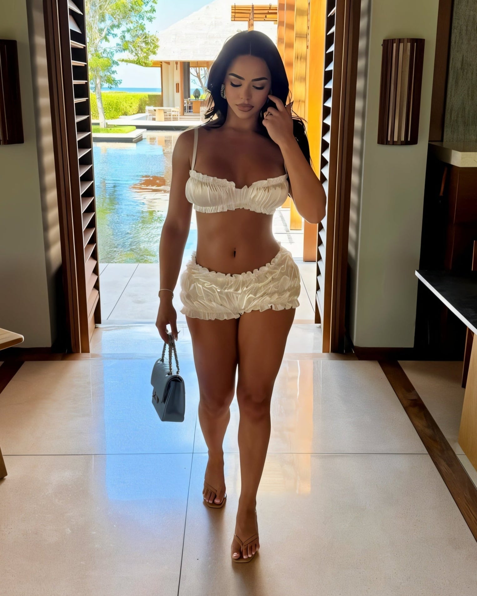The Eliana Set features a satin bralette with delicate ruffle trim and adjustable straps for a flattering, secure fit. Paired with high-waisted ruffle shorts, this set blends softness with structure in all the right places.