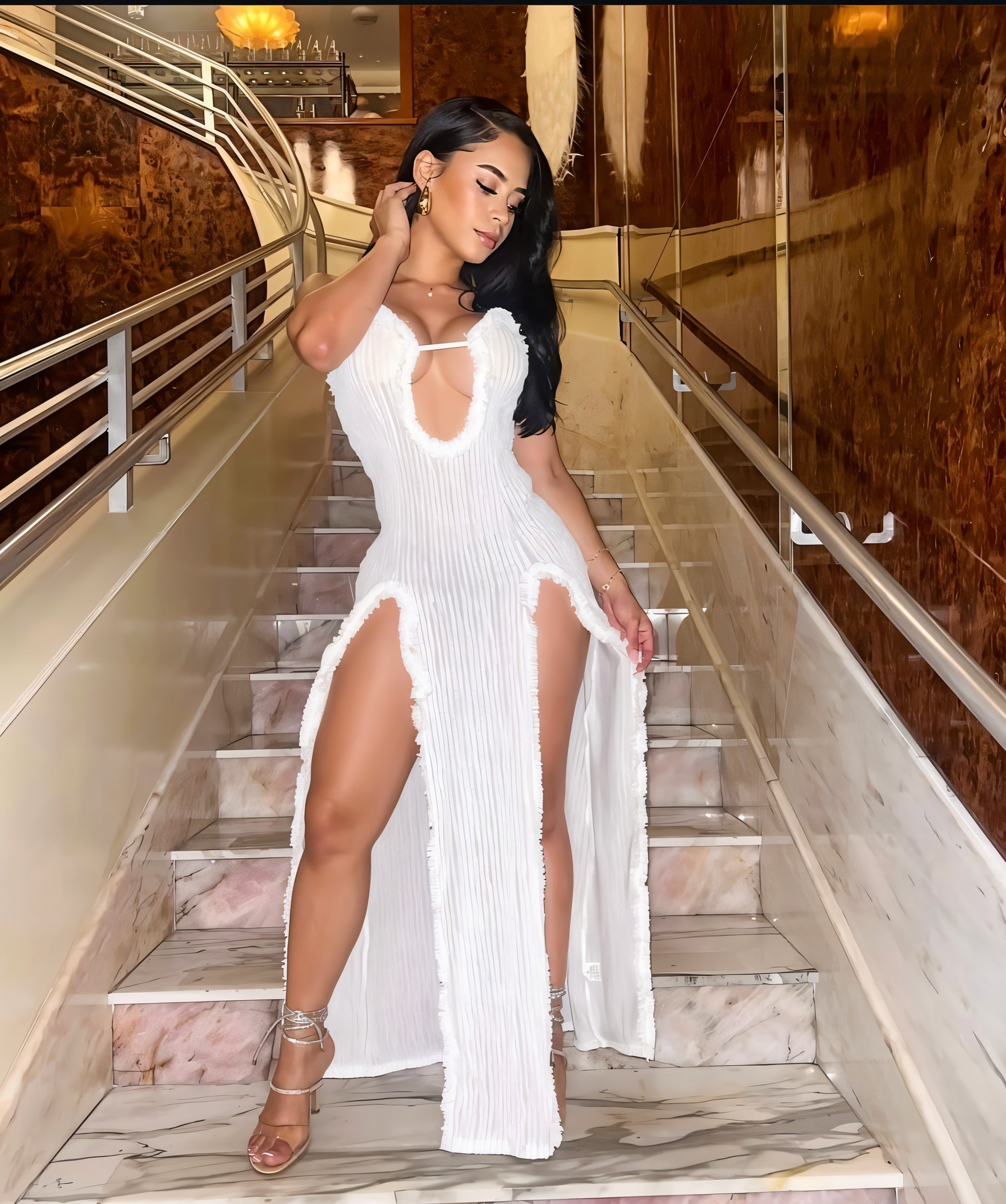 Slip into elegance with the ISLA Maxi Dress. Featuring a daring plunging neckline, thigh-high slits, and a curve-hugging pleated design, this dress is your ultimate look for turning heads and owning the night. Perfect for luxe dinners, exclusive events, or wherever you want to slay.