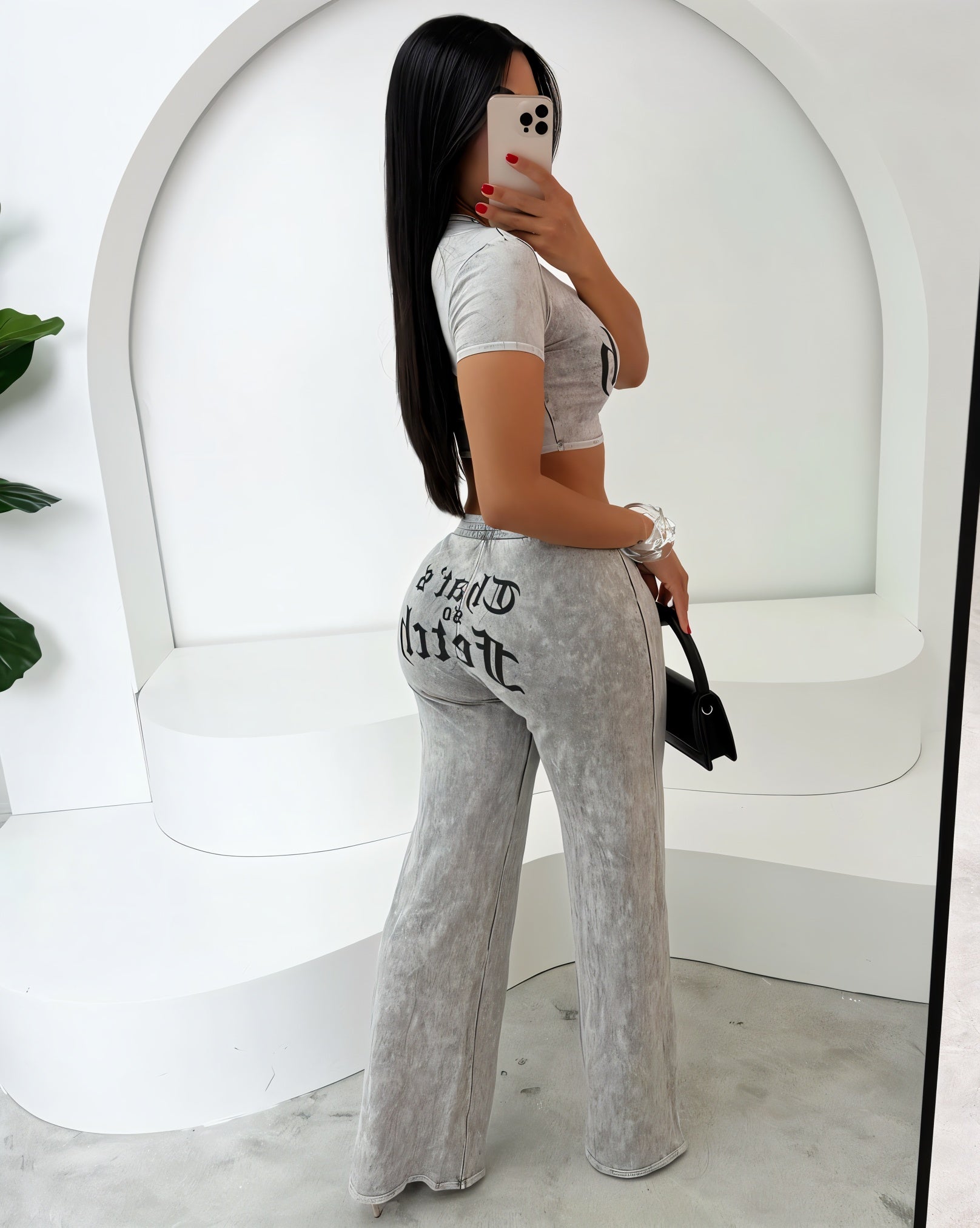 The Virelle Set brings laid-back energy with a bold edge. Featuring a fitted, cropped graphic tee with gothic-style lettering and high-waisted wide-leg pants in a washed grey finish, it’s built for statement-making comfort.